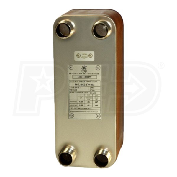 AIC LC110-40X2J Brazed Flat Plate to Plate Heat Exchanger is designed with copper single wall plates and stainless steel connections. L-line heat exchangers have a working temperature up to 445-degrees F. Typical applications include central heating, hydronic heating, solar and geothermic heating, industrial process heat recovery, condensers and evaporators in refrigeration systems, oil coolers, and close approach fluid-to-fluid heat transfer. The LC110-40X2J has a working pressure up to 481 psi.