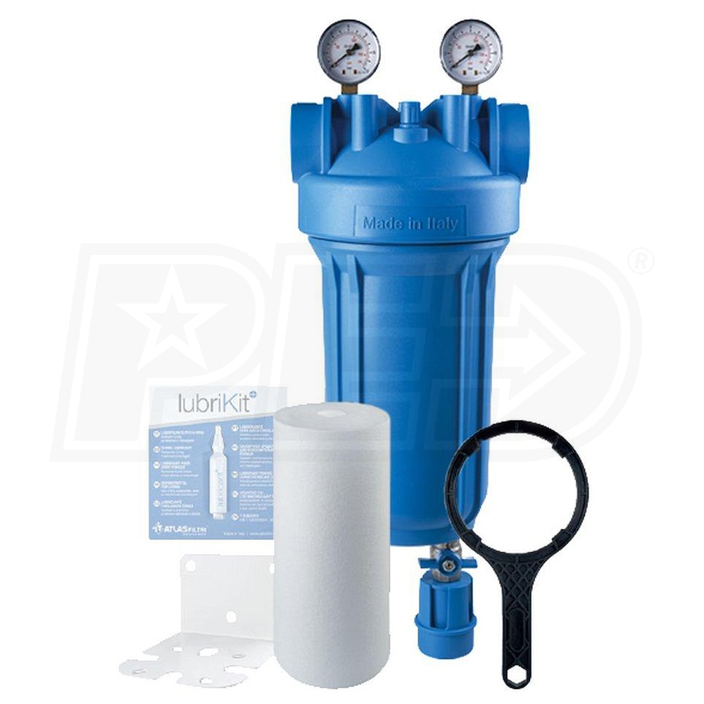 Atlas Filtri® - DP BIG MONO Blue Filter Housing Kit - Bracket/Wrench - 2 Gauges - 1 Drain Kit - 5 Micron Cart w/ ScaleArmor™ - 4.5" x 10" - 1" NPT