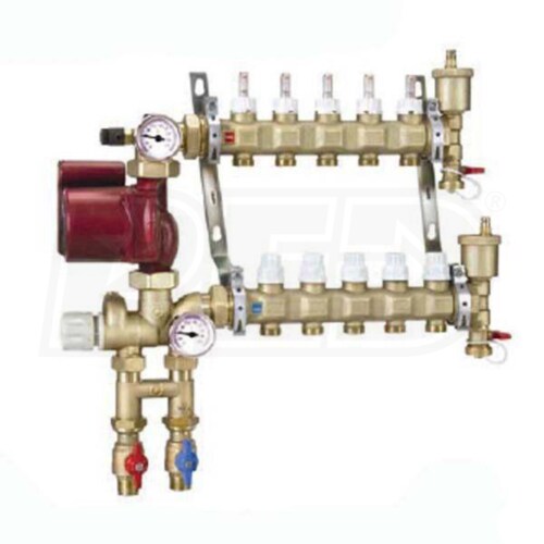 The Caleffi Pre-assembled Fixed Point Manifold Mixing Station is designed for use in a radiant panel systems in combination with distribution manifolds. The temperature is regulated by a dedicated hydraulic unit equipped with a specific motorized three-way valve. A removable differential by-pass kit for the primary circuit. The Caleffi Pre-assembled Fixed Point Manifold Mixing Station has 5 outlets.