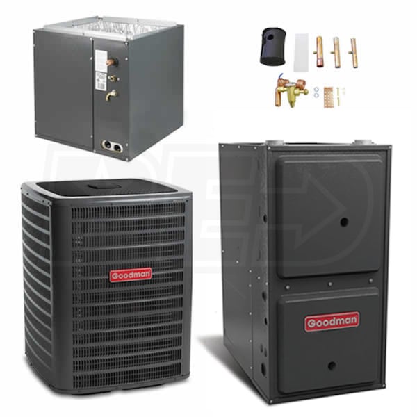 A Goodman high efficiency heat pump and furnace package is the perfect way to upgrade your home's HVAC system. This kit contains a DSZC two-stage heat pump with an advanced coil design to maximize efficiency. The heat pump is paired with a GCVC furnace equipped with an ECM variable speed motor. This pair was specifically chosen to provide efficient comfort year round. A cased coil and valve kit are included, making this kit an affordable, efficient, whole home solution.