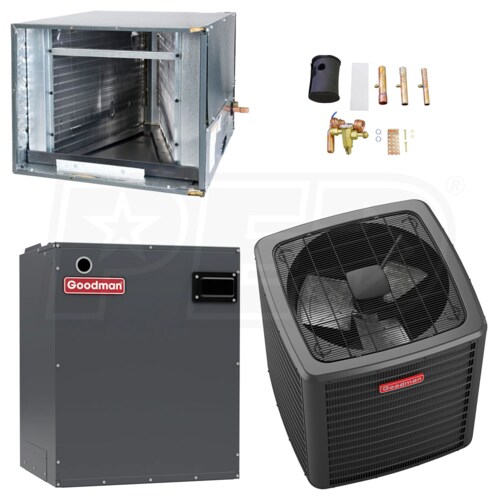 A Goodman high efficiency central air kit is the perfect way to upgrade your home's HVAC system. This kit contains a GSZV903610 heat pump and an MBVC1601AA-1 modular blower with a variable-speed blower motor with a CHPF Cased Coil. The variable-speed ECM motor provides you with energy efficient circulation. While each of these components enjoy the impressive durability and easy accessibility for which Goodman is famous, their energy efficiency is the real selling point. State-of-the-art design and technology make the GSZV903610 MBVC1601AA-1 CHPF3642C6 TXV an excellent addition to nearly any household looking to reduce their energy spending.