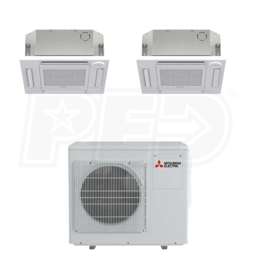 Mitsubishi Ceiling Cassette Mini Split Heat Pump System - 2-Zone - 20k BTU Outdoor - 9k + 15k Indoor - 20.0 SEER2 - R-454B