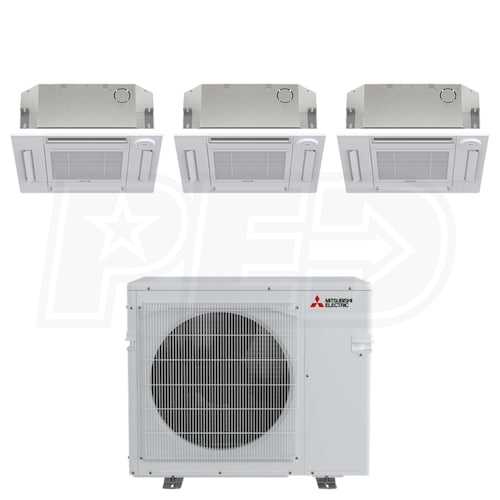 Mitsubishi Ceiling Cassette Mini Split Heat Pump System - 3-Zone - 42k BTU Outdoor - 18k + 18k + 18k Indoor - 19.3 SEER2 - R-454B