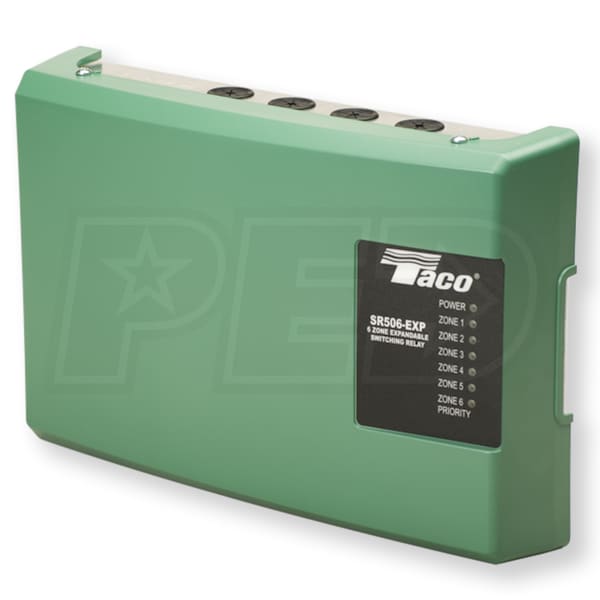 Taco's SR506-EXP-4 is a six zone zone pump switching relay. With universal thermostat compatibility, it is designed to integrate quickly and effortlessly into any hydronic system, bringing Taco reliability to your zoned operations. Post purge and pump exercise operation modes will run your pumps briefly after calls for heat or long periods of inactivity. These improve the efficiency and dependability of your system, respectively. The SR506-EXP-4's enclosure is unobtrusive and easy to mount in tight spaces, and the PC board was designed for quick maintenance and clean, simple wiring.